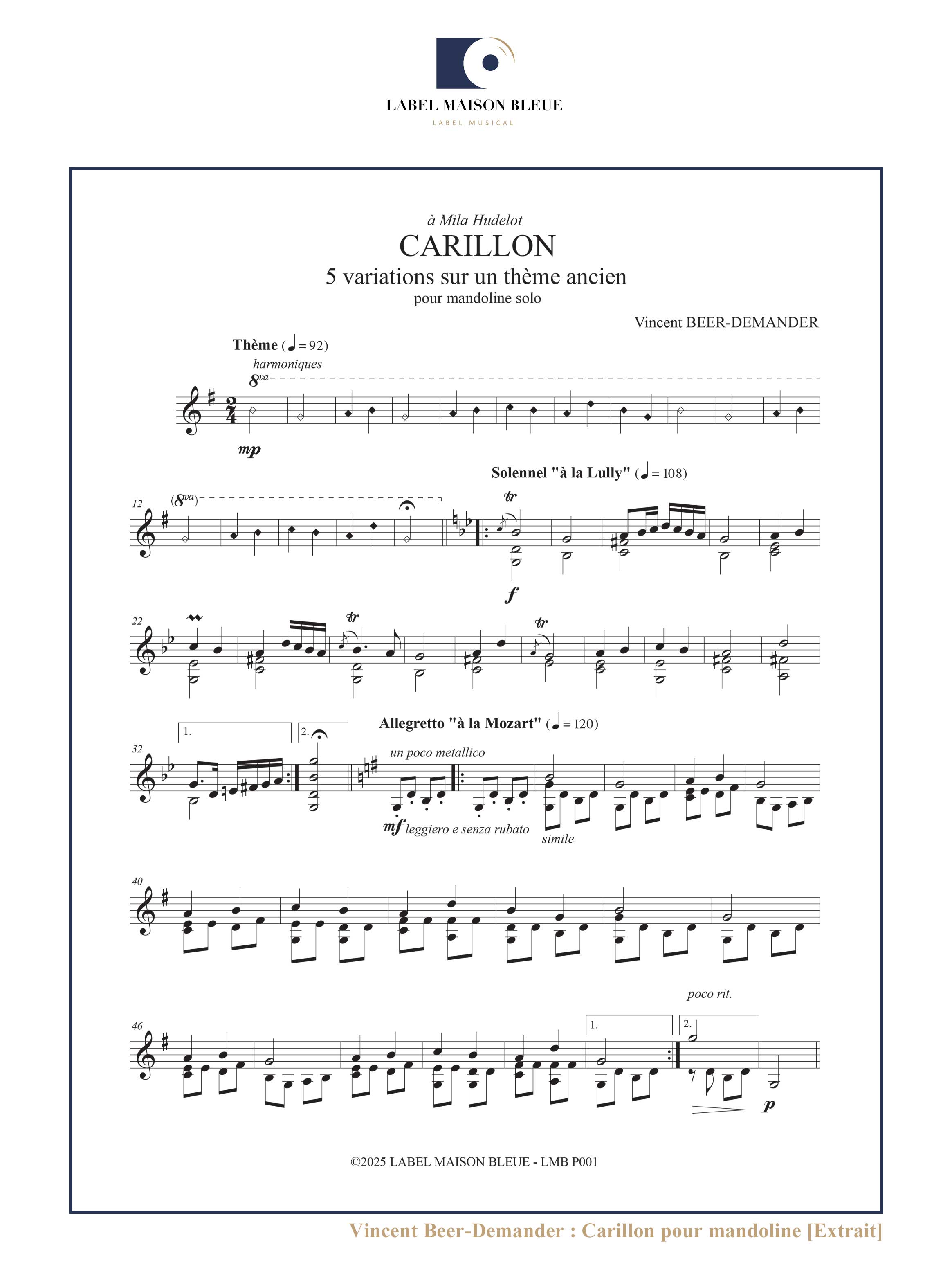 J’ai composé cette œuvre pour mon élève Mila Hudelot. Ces variations, bien que relativement accessibles d’un point de vue technique on toute légitimité à être donnés en concert. Mon travail a consisté à m’emparer d’un des thèmes populaires français les plus anciens et les plus connus afin de l’habiller à travers les principales esthétiques de l’histoire de la musique.